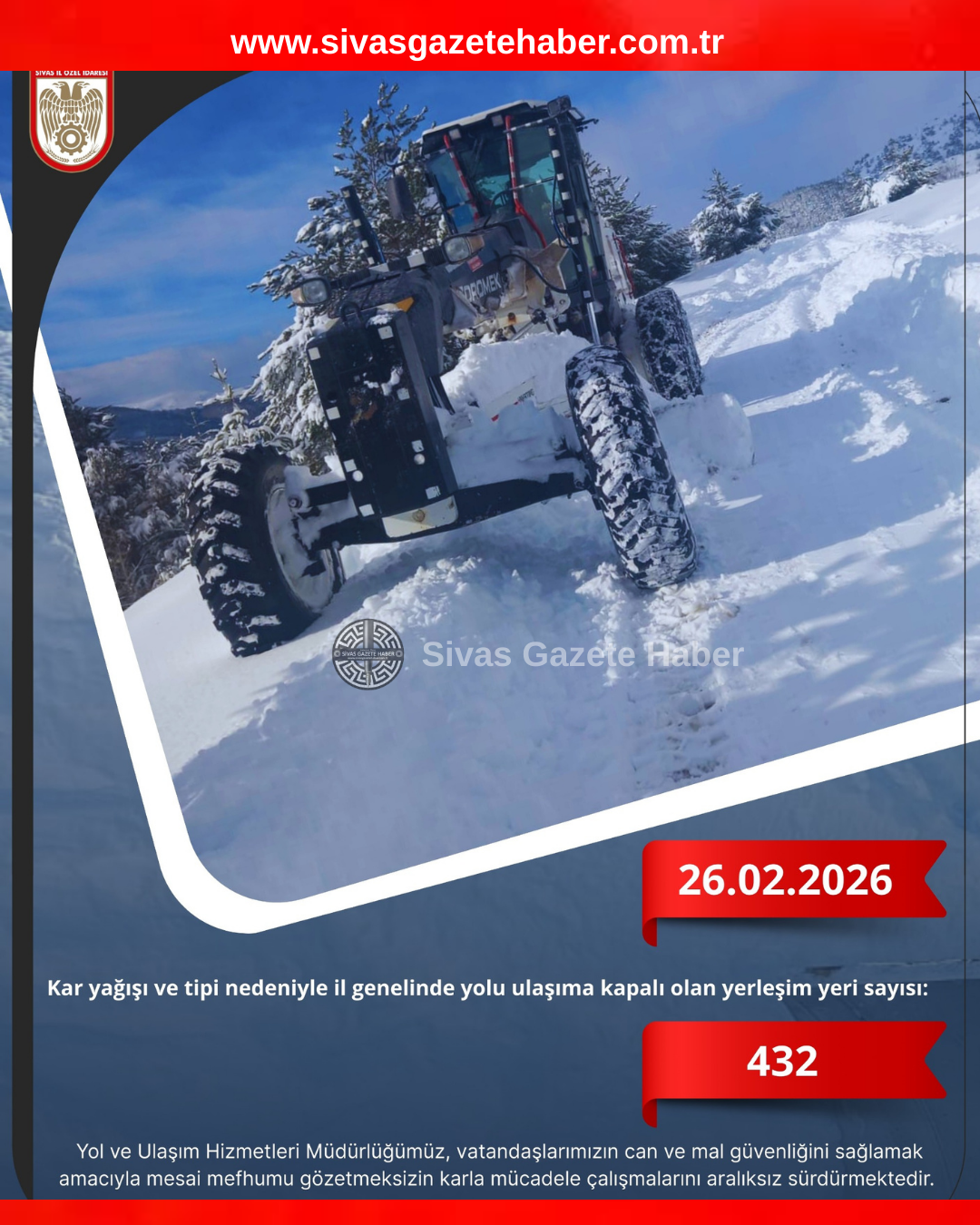 İlimiz genelinde etkili olan kar yağışı ve tipi nedeniyle yolu ulaşıma kapalı olan 432 yerleşim yerinde ekiplerimiz yoğun mesaiyle çalışmalarını sürdürüyor.
