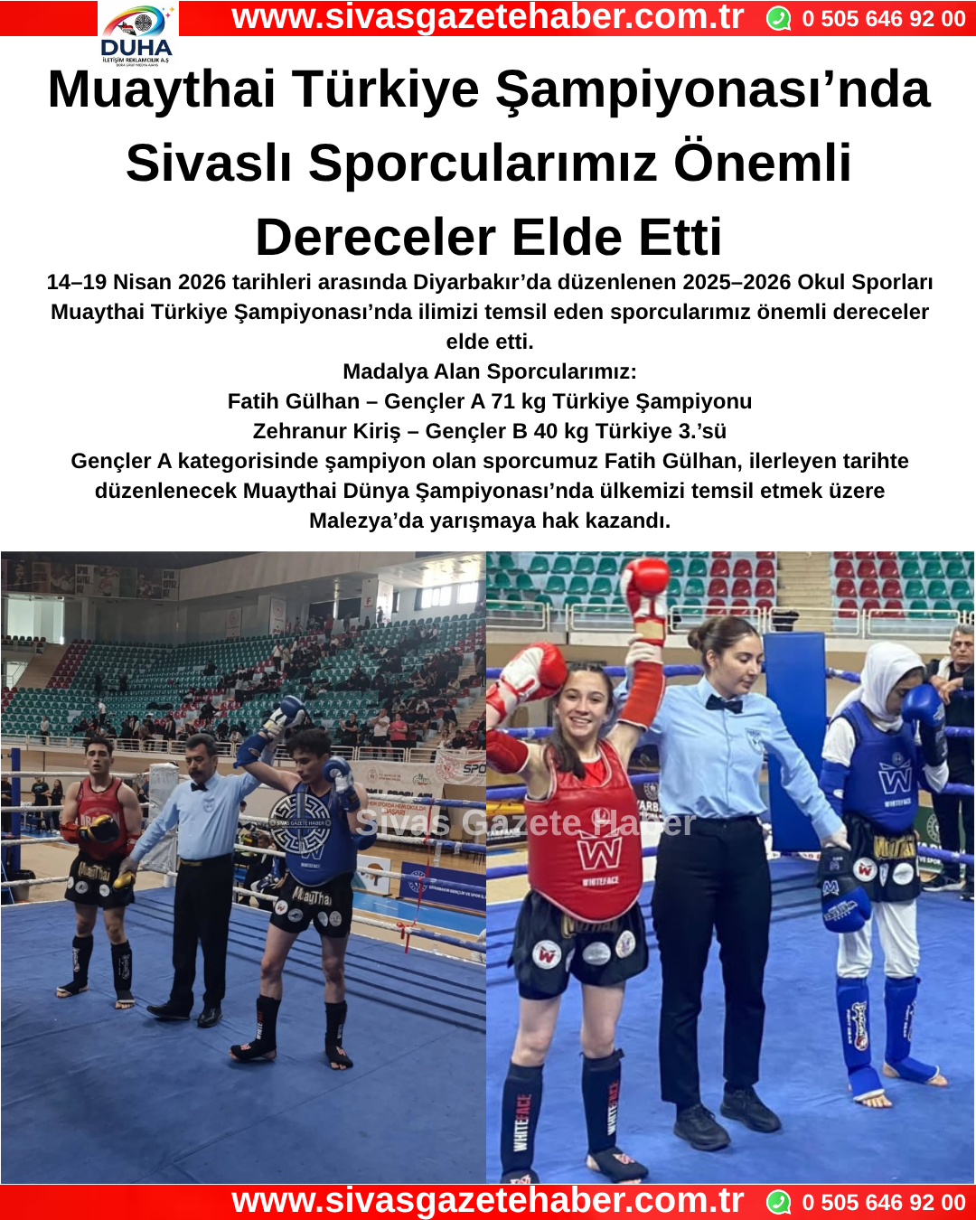14–19 Nisan 2026 tarihleri arasında Diyarbakır’da düzenlenen 2025–2026 Okul Sporları Muaythai Türkiye Şampiyonası’nda ilimizi temsil eden sporcularımız önemli dereceler elde etti.