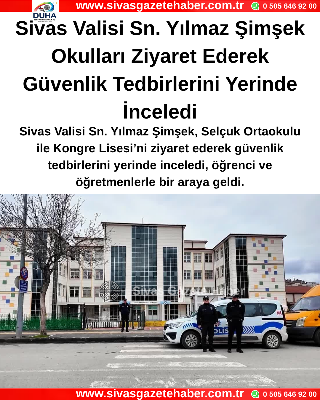 Sivas Valisi Sn. Yılmaz Şimşek, Selçuk Ortaokulu ile Kongre Lisesi’ni ziyaret ederek güvenlik tedbirlerini yerinde inceledi, öğrenci ve öğretmenlerle bir araya geldi.