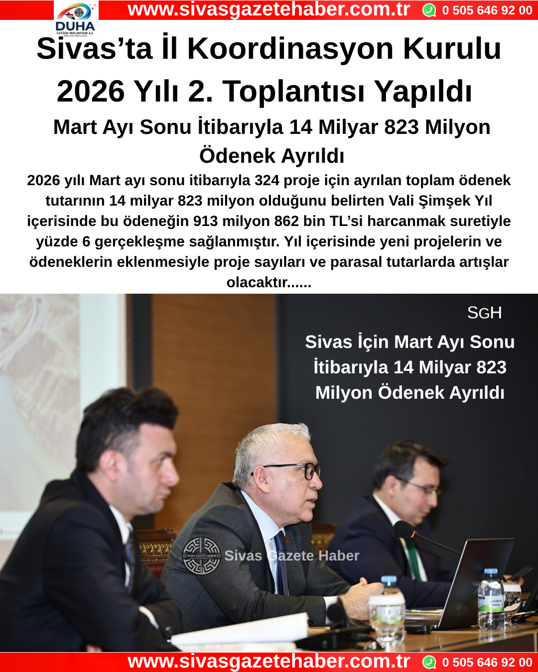 “Yıl içerisinde bu ödeneğin 913 milyon 862 bin TL’si harcanmak suretiyle yüzde 6 gerçekleşme sağlanmıştır. Yıl içerisinde yeni projelerin ve ödeneklerin eklenmesiyle proje sayıları ve parasal tutarlarda artışlar olacaktır. Malumunuz Sivas için inşaat sezonu yeni başlıyor. Sezonu en iyi şekilde değerlendirebilmek ve kamu yatırımlarında gecikmeye mahal vermemek adına planlama ve koordinasyon çok önemli. Bu süreçte tüm kurumlarımızın işleri kolaylaştırıcı bir yaklaşım belirlemesini özellikle rica ediyorum. Birazdan yatırımcı kurumlarımıza söz vereceğim. Özellikle Koç Regülatörü, Kuzey Çevre Yolu, Çamlıbel Tüneli ve Havaalanı Yeni Pisti gibi ilimiz açısından stratejik öneme sahip yatırımlarla ilgili müdürlerimizin kurul üyelerini bilgilendirmesini istiyorum. Ben son olarak şehrimize verdiği destekleri için Sayın Cumhurbaşkanımız başta olmak üzere TBMM AK Parti Grup Başkanı Sayın Abdullah Güler ve tüm milletvekillerimize teşekkür ediyorum. Aynı zamanda, bu yatırımların planlanmasından nihayete ermesine kadar geçen süreçte; sahada ve masada büyük bir gayretle çalışan, emeğini, fikrini ve desteğini ortaya koyan tüm kamu görevlilerimize ve paydaşlarımıza ayrı ayrı teşekkür ediyorum. Yatırımlarımızın kadim şehrimiz Sivas’a hayırlı ve uğurlu olmasını diliyorum.”
