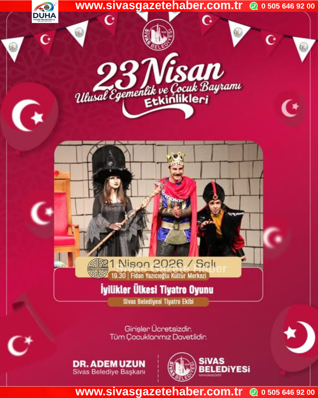 23 Nisan Ulusal Egemenlik ve Çocuk Bayramı Etkinlikleri Kapsamında Sivas Belediyesi tiyatro ekibi tarafından sahnelenecek “İyilikler Ülkesi” adlı tiyatro oyununa tüm çocuklarımız davetlidir.